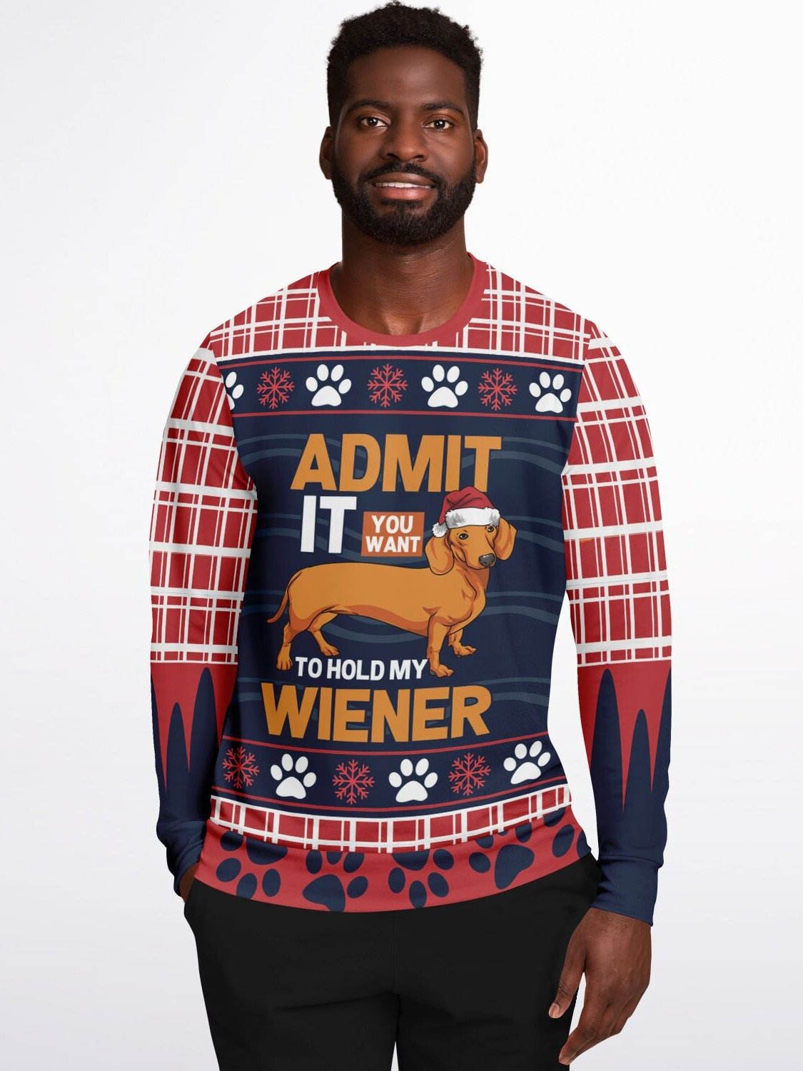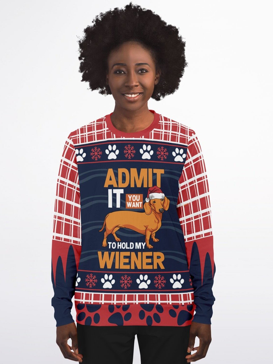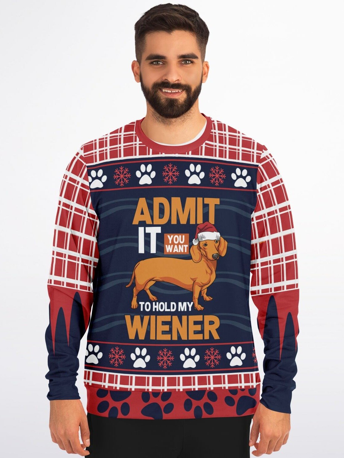 "Admit It You Want to Hold My Wiener" Funny Dog Christmas Sweatshirt | Dachshund Holiday Jumper | Dog Lover Santa Pet Humor | Unisex Xmas Gift