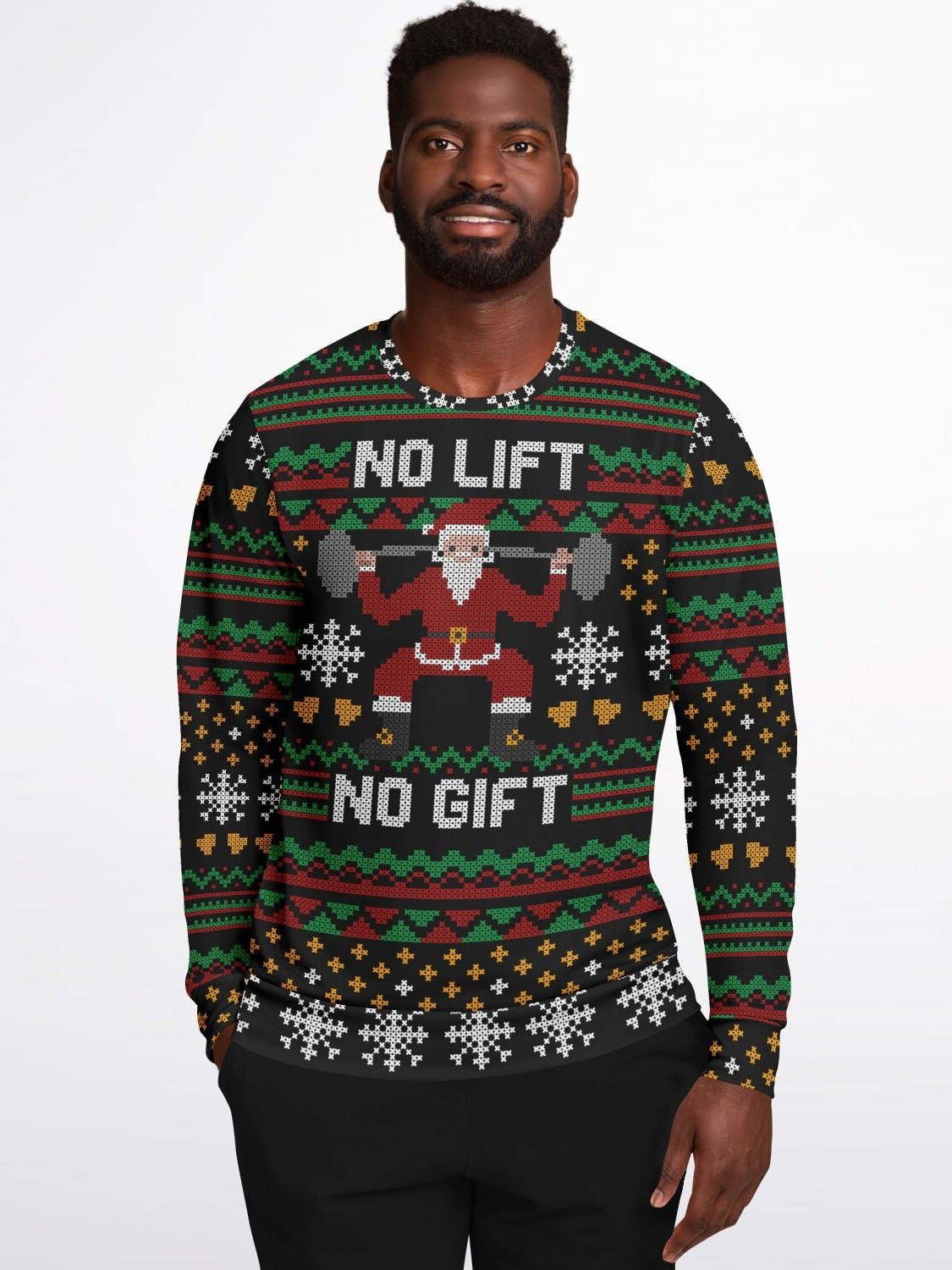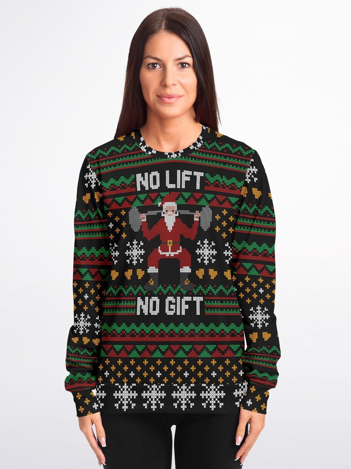 "No Lift No Gift" Gym Christmas Sweater | Funny Weightlifting Santa Ugly Sweater | Fitness Holiday Pullover