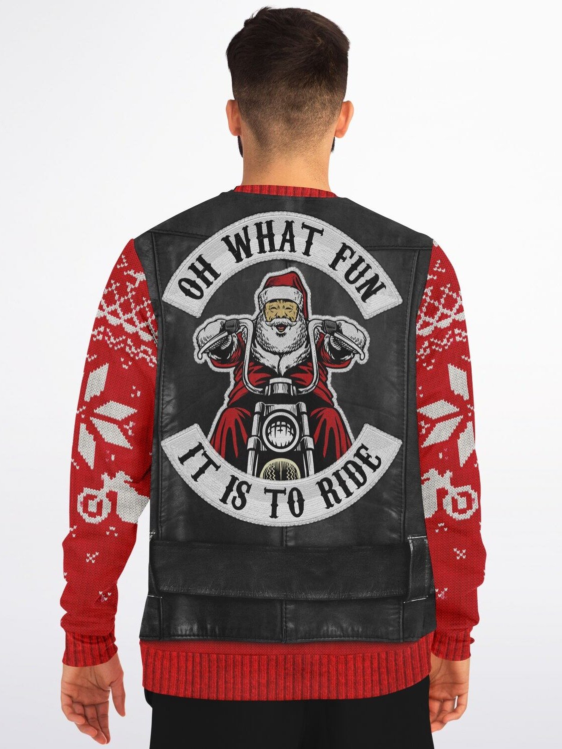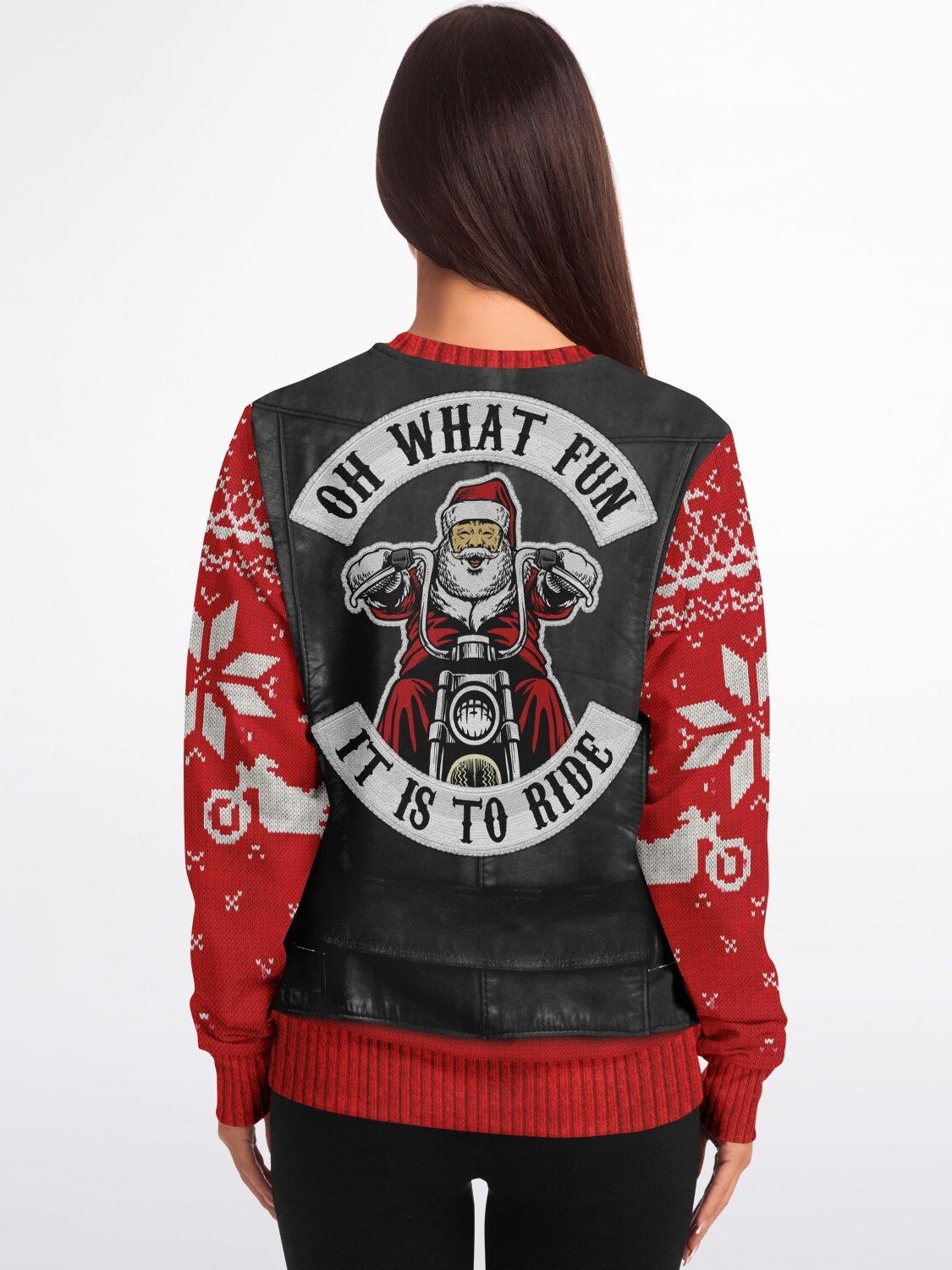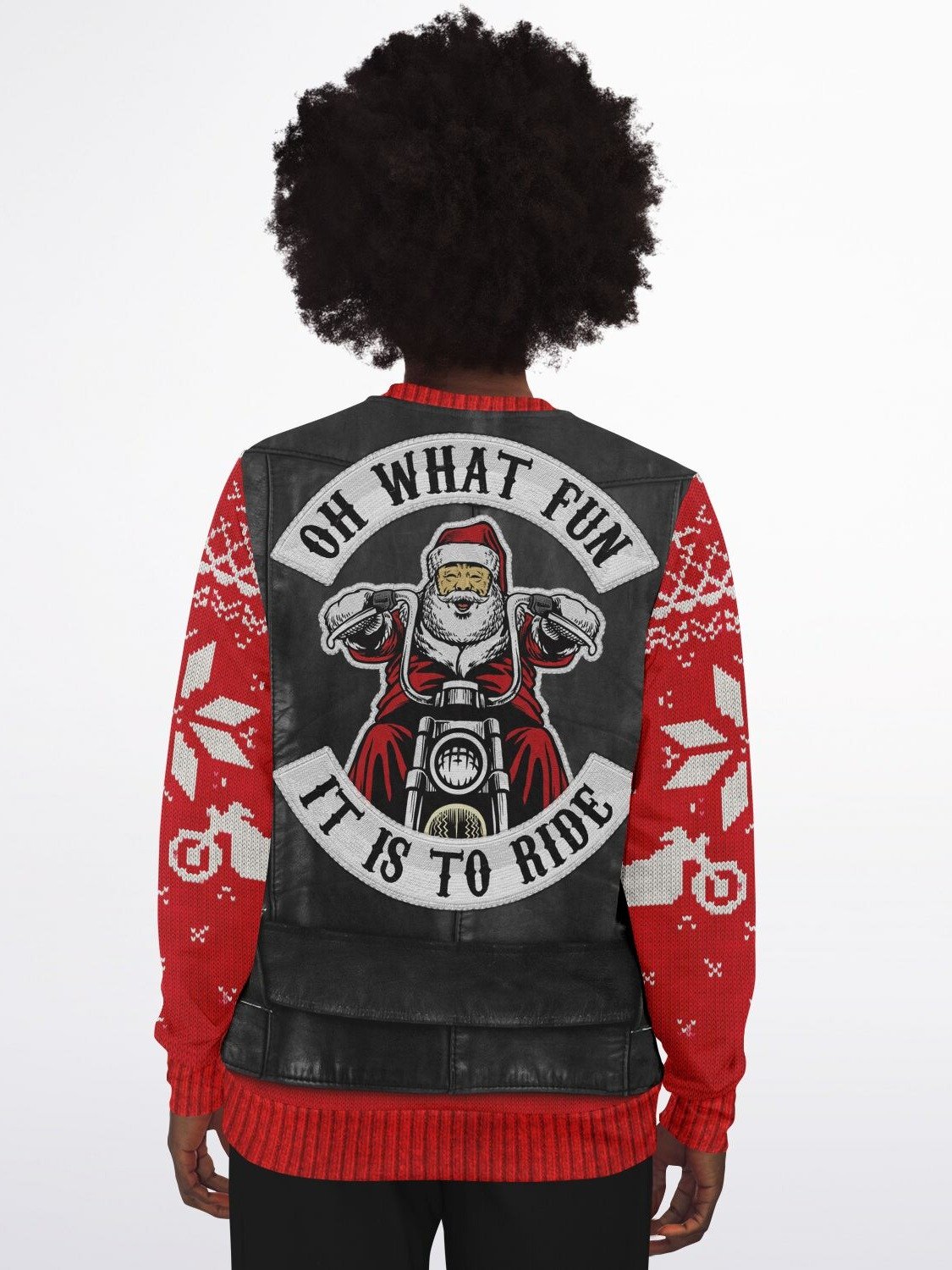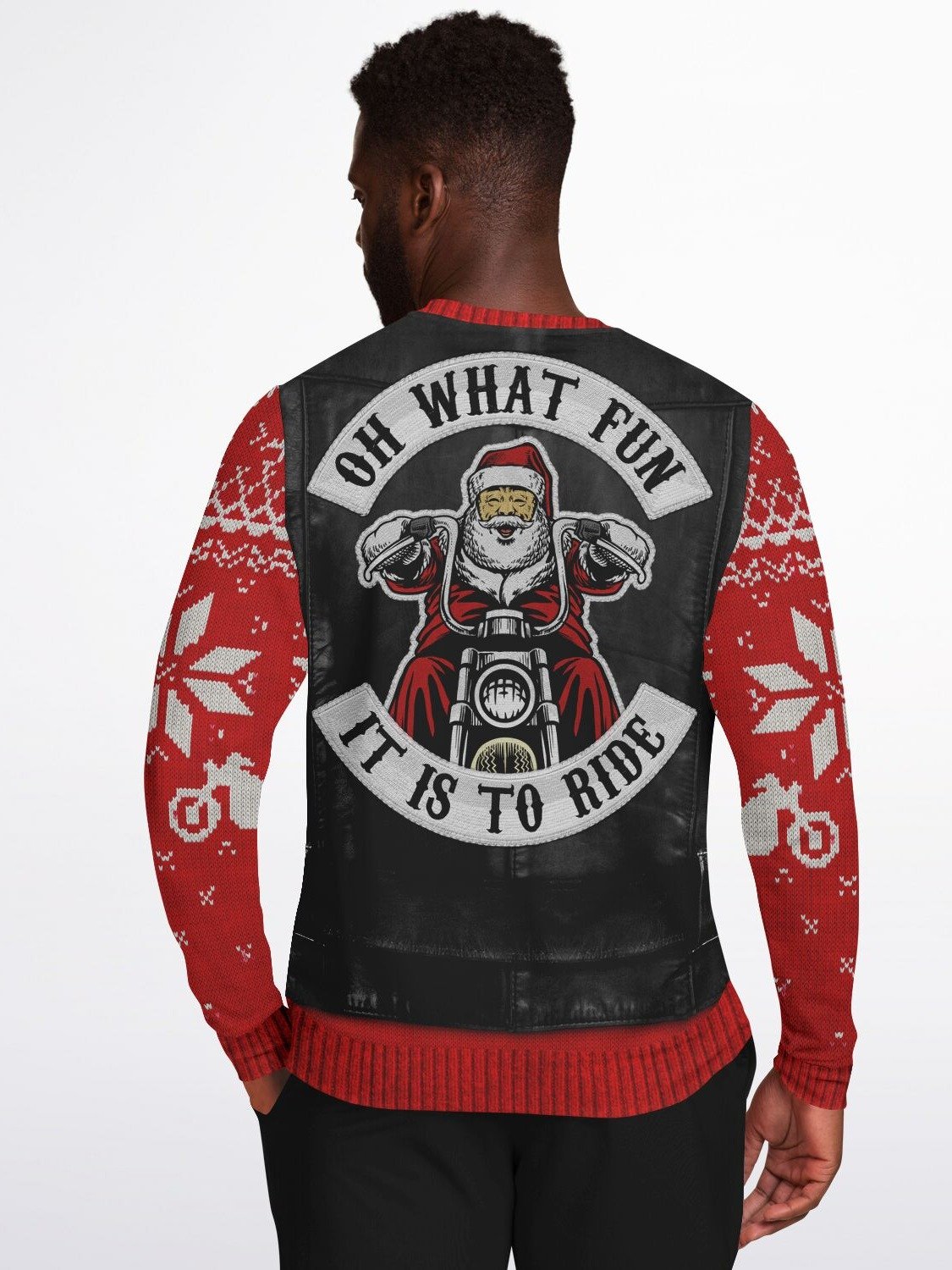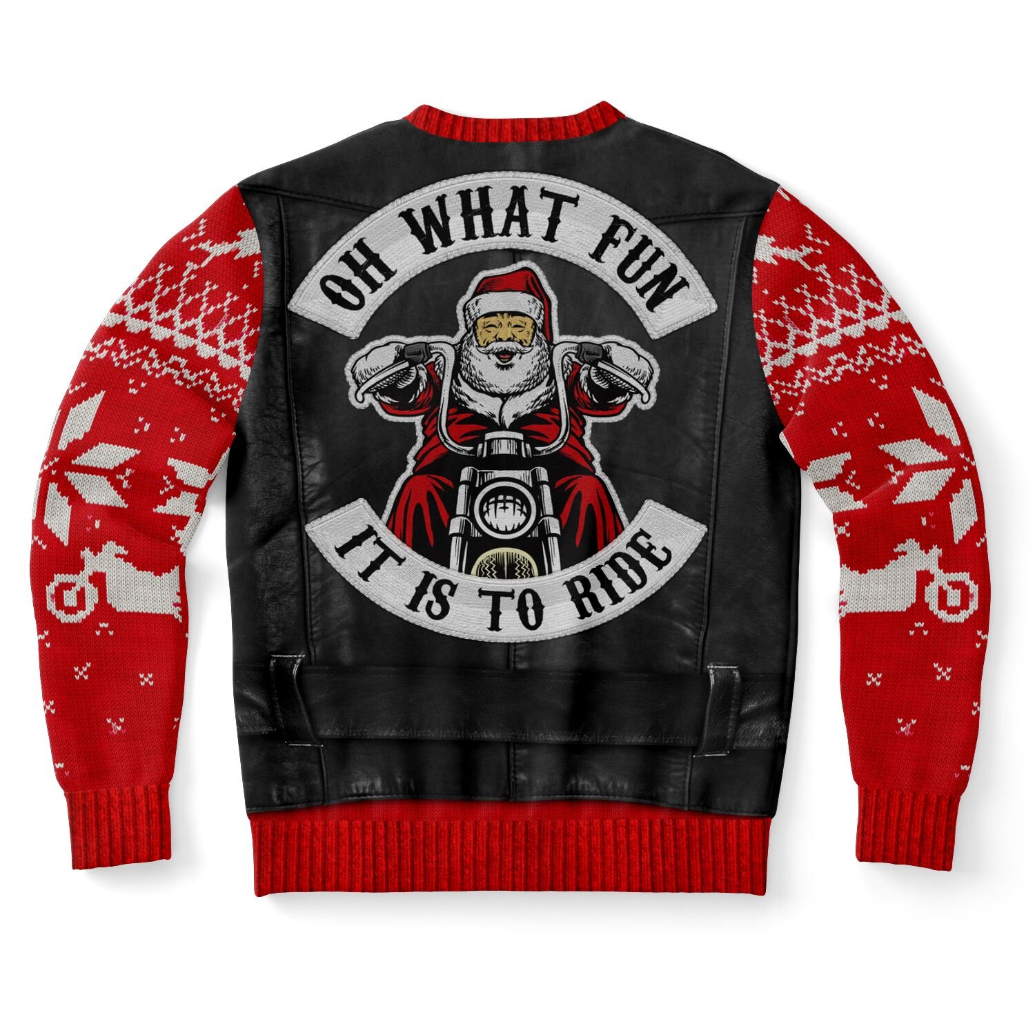 "Oh What Fun It Is To Ride" Ugly Christmas Sweater | Biker Santa Leather Vest Christmas Sweater | Motorcycle Holiday Jumper