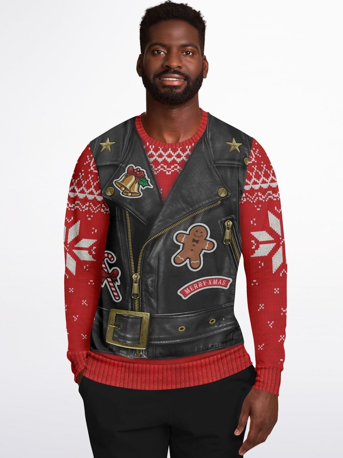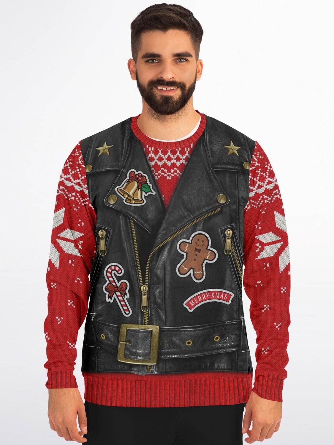 Rev up your holiday style! 🎅🏍️ This isn't your average Christmas sweater – it's a rebel with a Claus! Our exclusive biker-inspired holiday sweater combines the badass look of a leather motorcycle vest with cozy Christmas knit sleeves that'll have you ruling the North Pole motorcycle club in style.