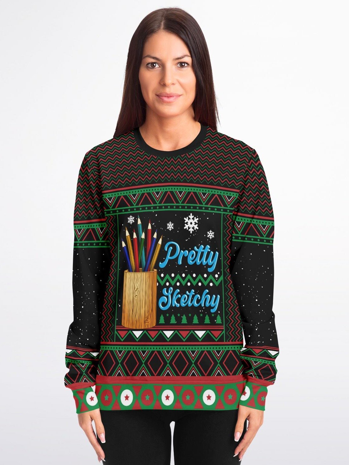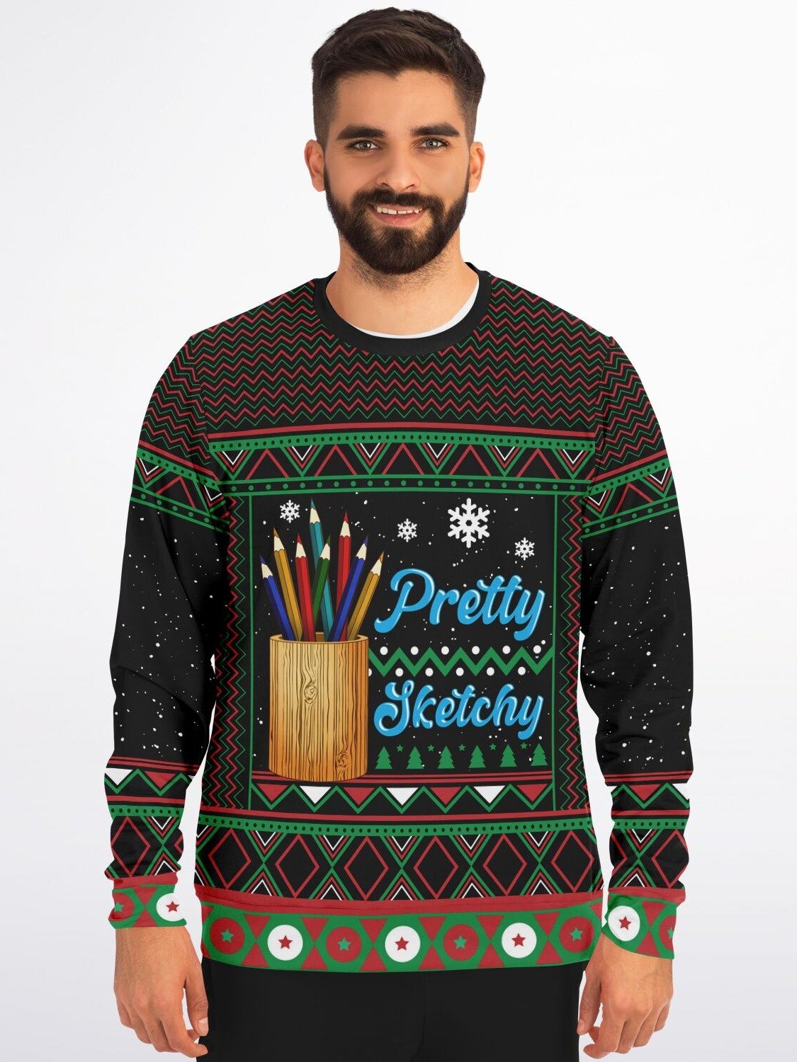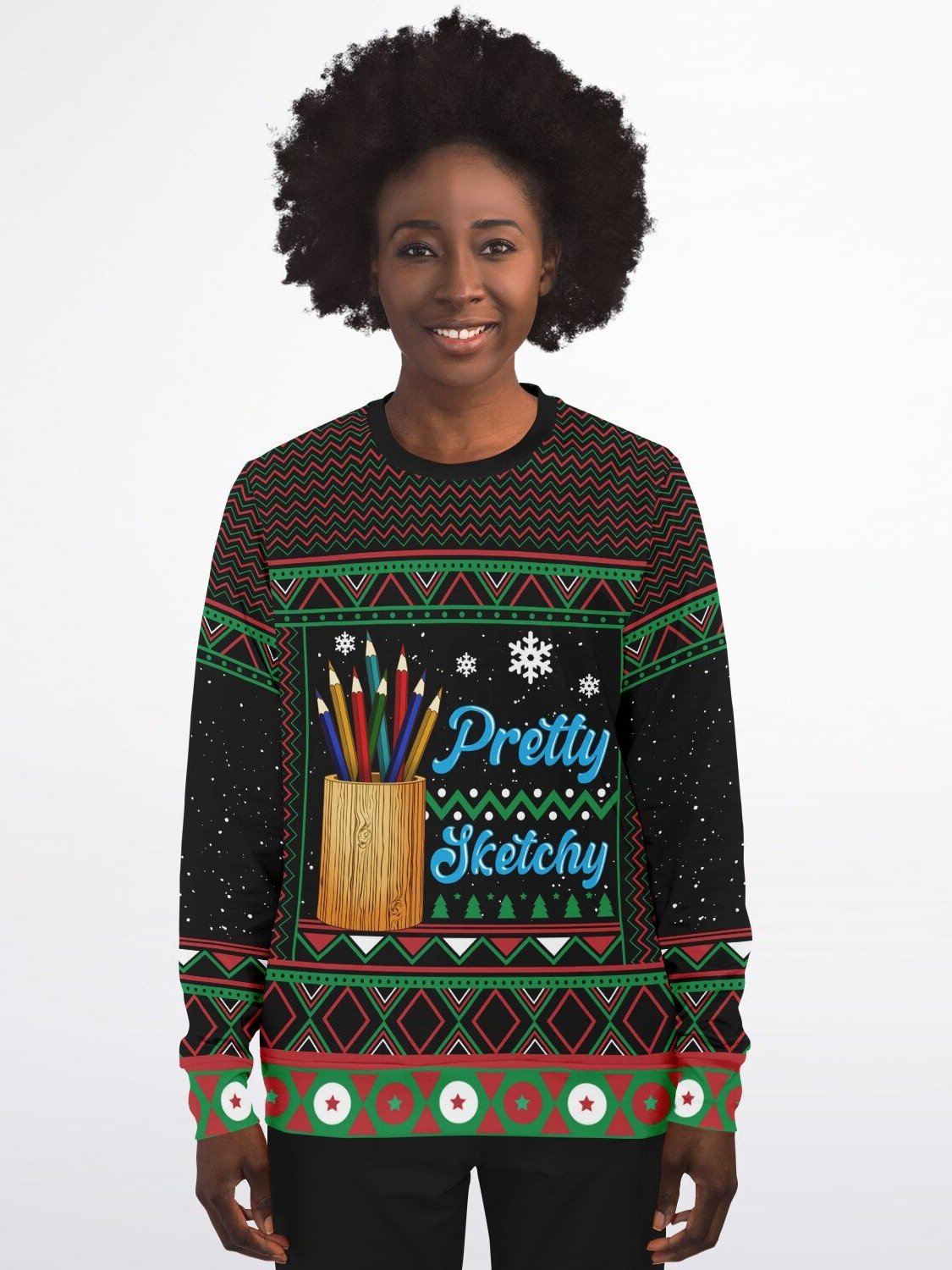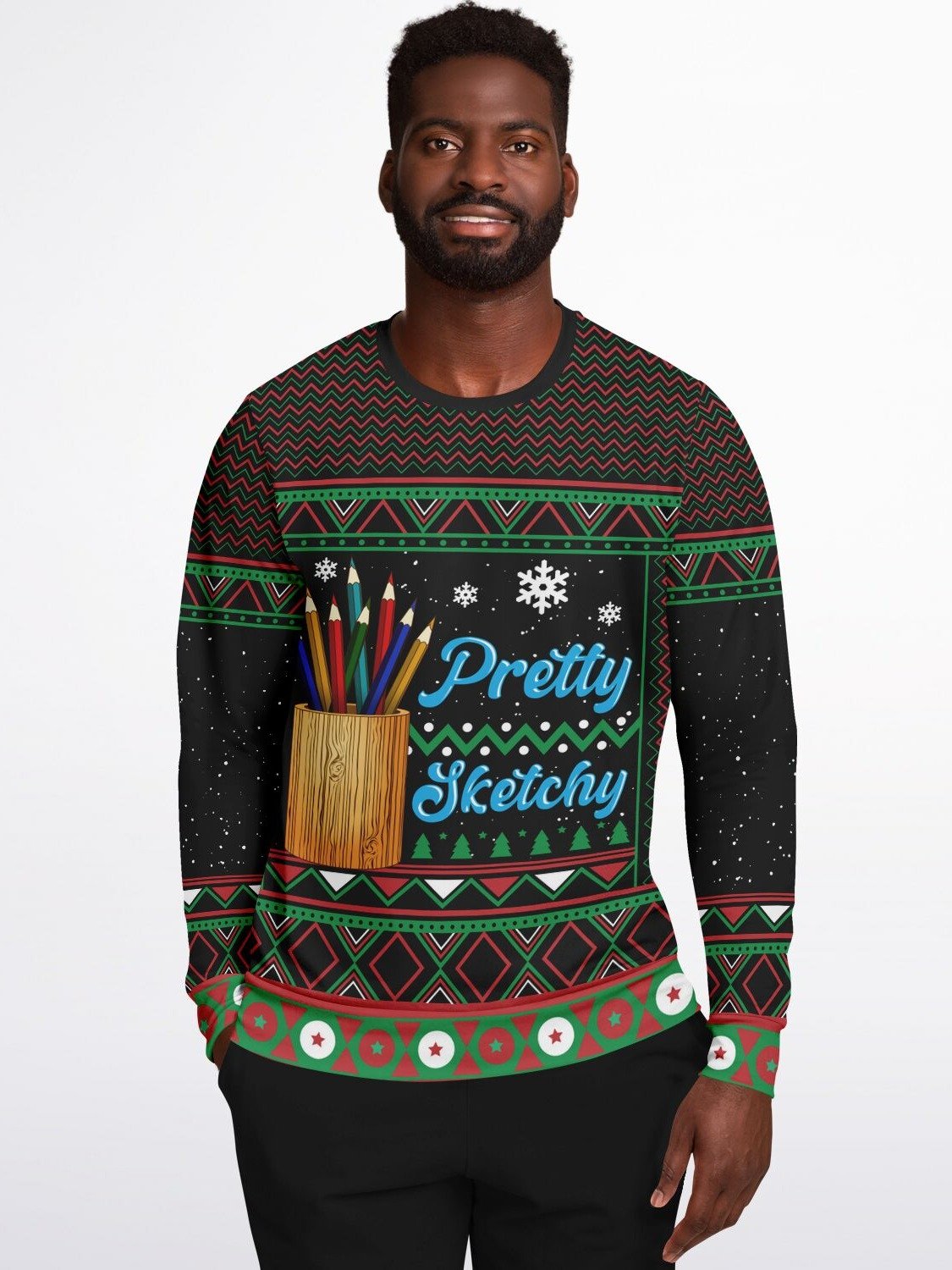 Get into the holiday spirit with our "Pretty Sketchy" Christmas Sweater! This fun and festive sweater is perfect for artists and creative minds who want to showcase their love for sketching during the holiday season. The sweater features a vibrant design with colorful pencils in a wooden holder, surrounded by snowflakes and the playful phrase "Pretty Sketchy" in bright blue letters. The background is adorned with traditional holiday patterns in red, green, and black, making it a standout piece for any holiday gathering. Made from comfortable and cozy materials, this sweater is ideal for staying warm and stylish. Whether you're attending an ugly sweater party or just want to spread some holiday cheer, this sweater is sure to be a hit!