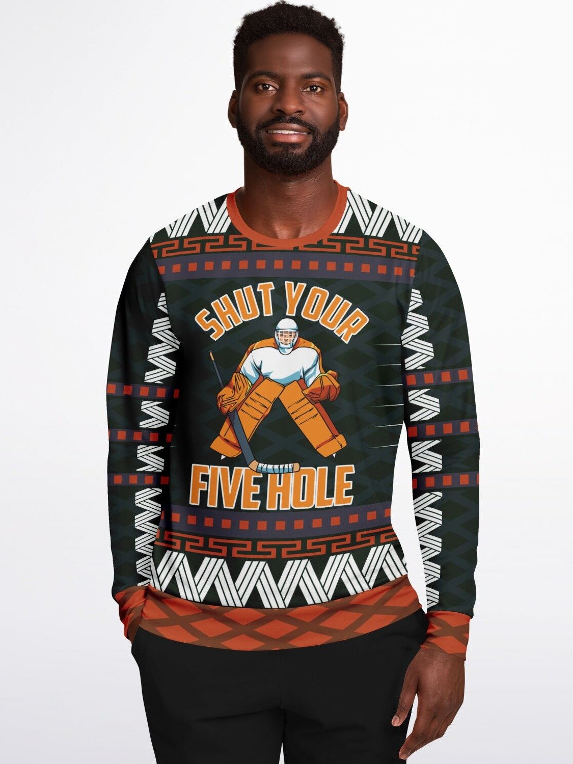"Shut Your Five Hole" Hockey Goalie Ugly Christmas Sweater – Funny Holiday Sweater for Hockey Fans, Perfect for Winter Parties