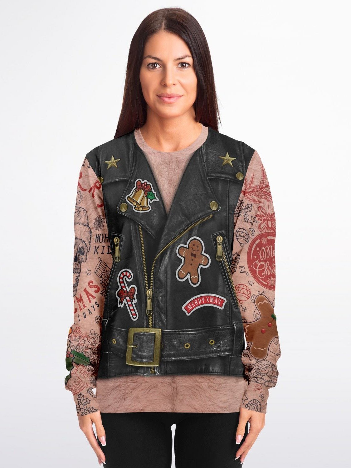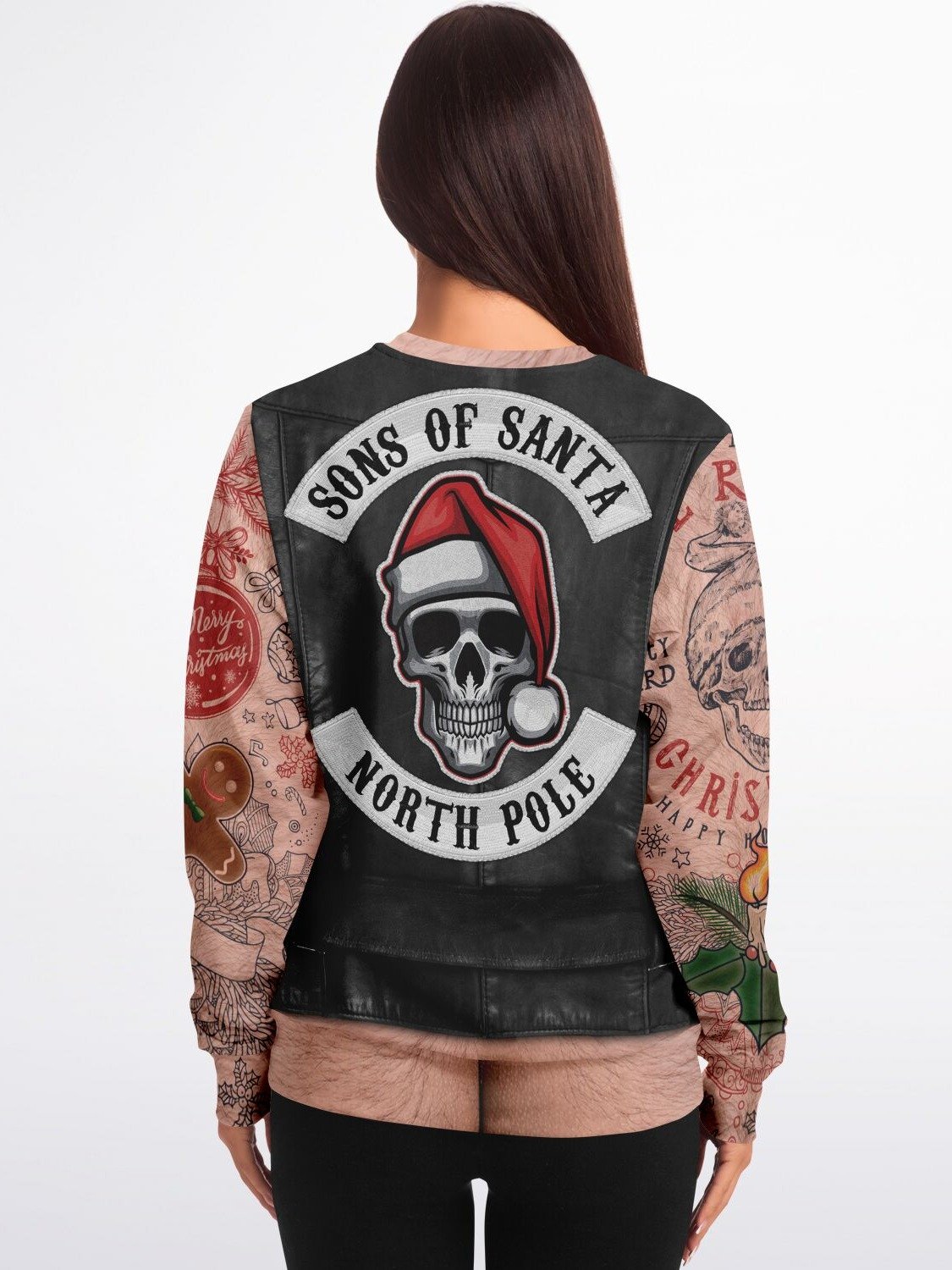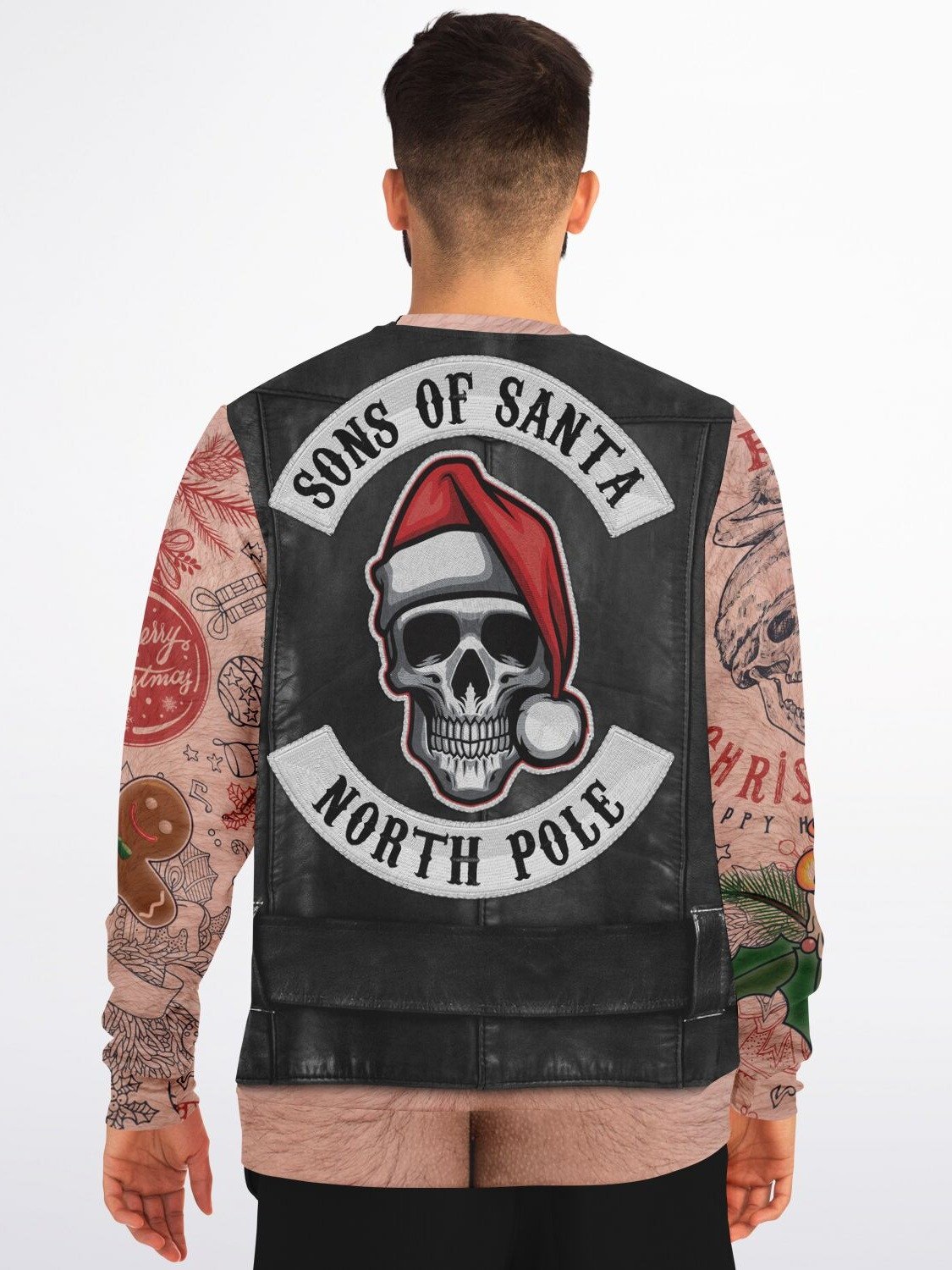 "Sons of Santa" Biker Christmas Sweater - Bad Santa MC Leather Vest Design - Edgy Holiday Ugly Sweater